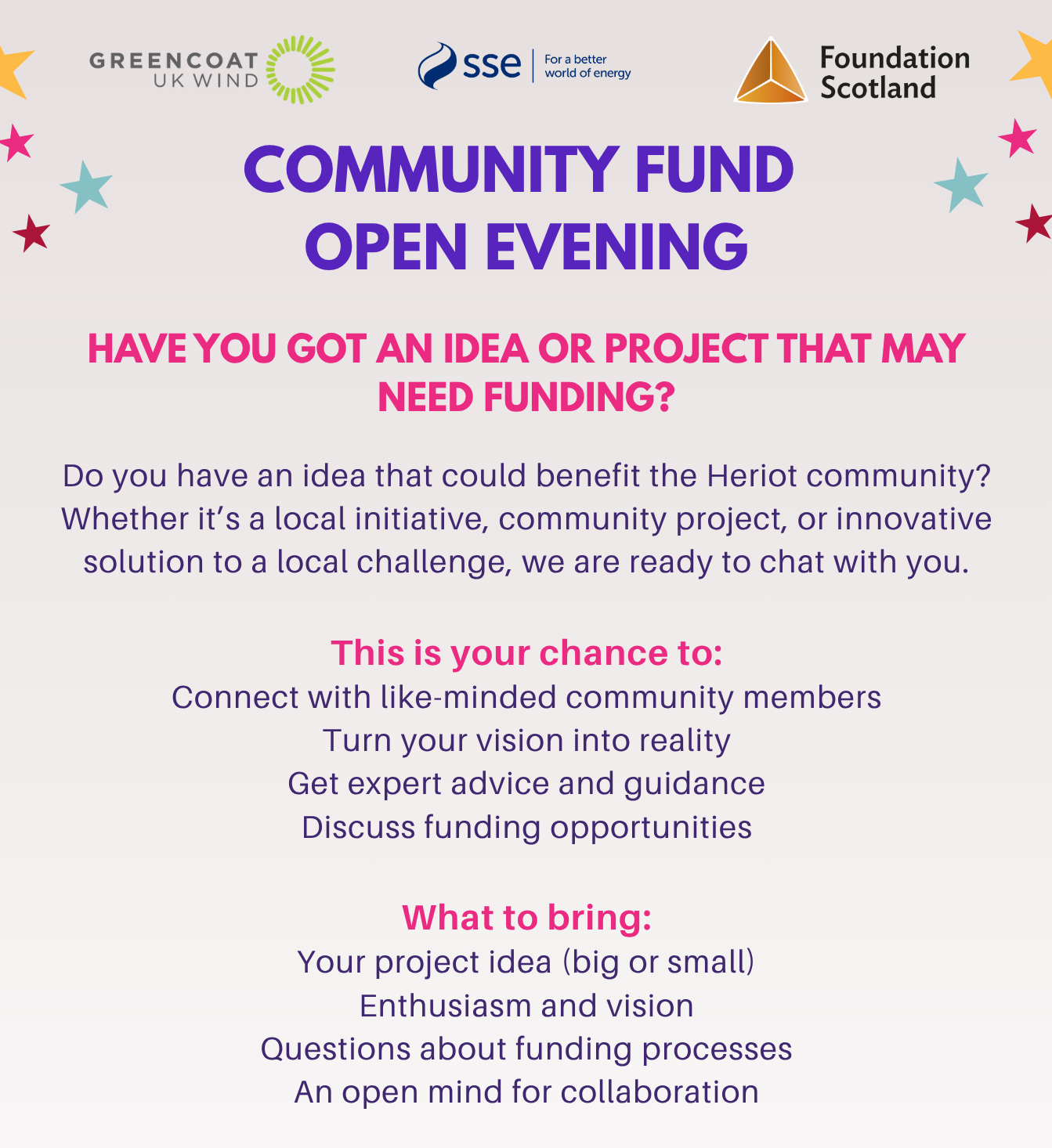 To help the Heriot community identify ideas for projects that could make a difference to the local community, members of the local decision-making panel organised two open sessions for anyone interested in finding out more about funding was available and how funding could support local projects.