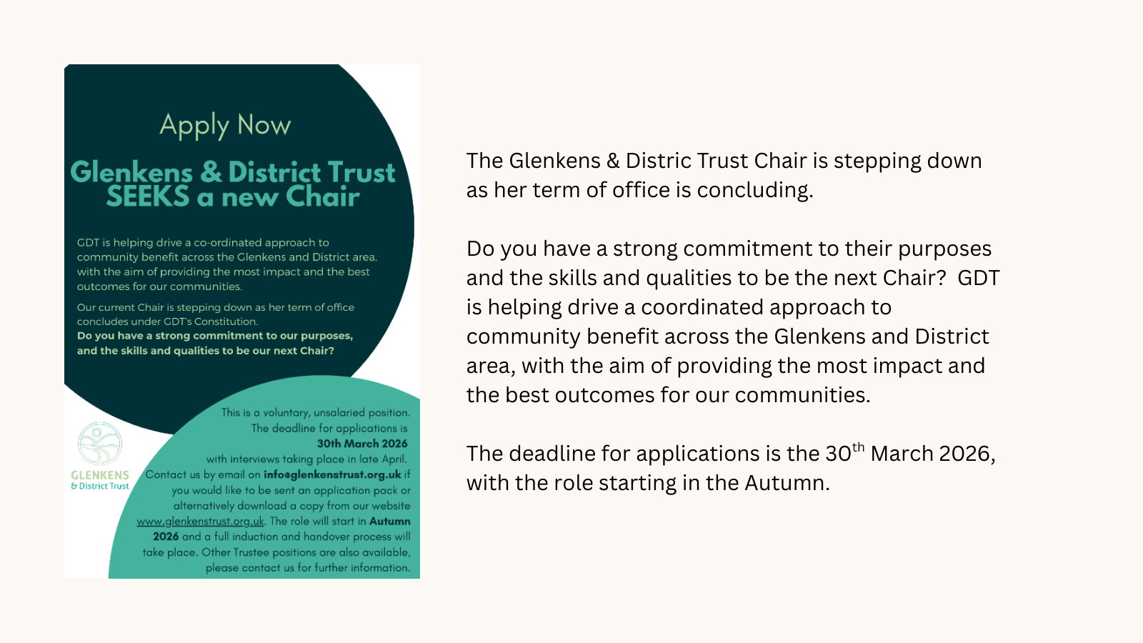 The Board is made up of Trustees nominated by Community Councils in the fund area along with up to five independent Trustees. Trustees are drawn from the community council areas of Dunscore; St John’s Town of Dalry; New Galloway & Kells; Balmaghie; Crossmichael; Parton; Corsock & Kirkpatrick Durham; and Balmaclellan. Carsphairn Community Council and Glencairn Community Council are eligible to join as Members but, to date, have not chosen to do so. A list of the current Trustees and more information about GDT including summaries of Board meetings can be found here.